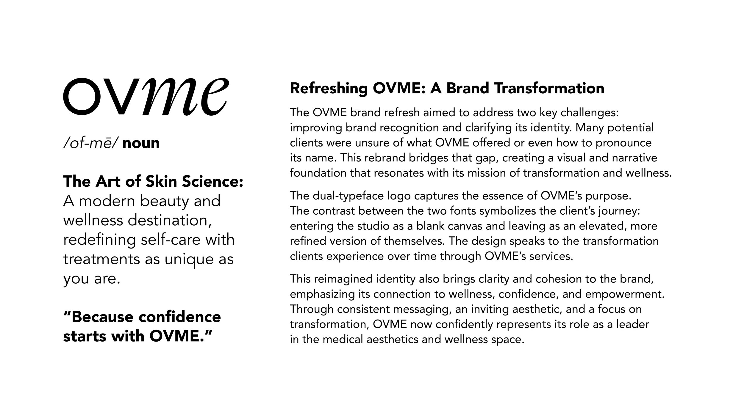 With OVME undergoing seven redesigns in just two years, its visual identity had become inconsistent and unclear. As Creative Lead, I streamlined the brand’s aesthetic by refining its core elements—logo, typography, and color scheme—ensuring a polished, high-end look. Brand testing revealed that many misread or mispronounced the name, even mistaking OVME for an ovarian clinic. To address this, I redesigned the logo using a dual-typeface approach to improve clarity and recognition. I also removed design elements, like doodles, that weakened the brand’s premium appeal. To maintain consistency across marketing, signage, packaging, and digital platforms, I developed comprehensive brand guidelines, solidifying OVME’s identity as a modern, sophisticated aesthetic brand.